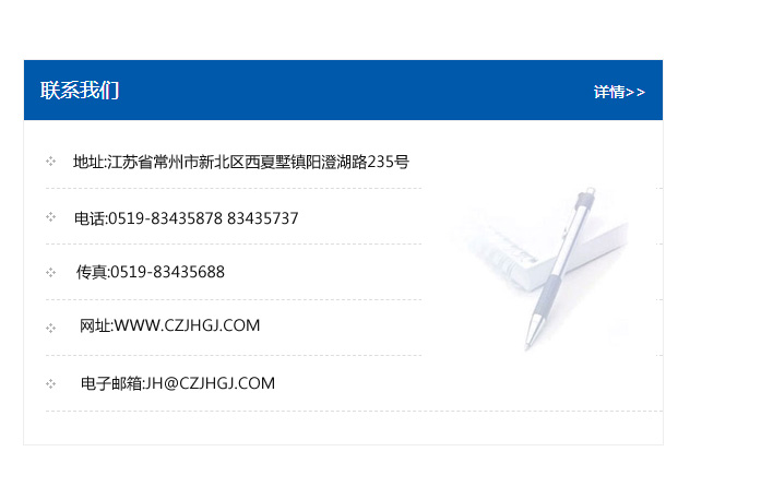 傳真:0519-83435688    郵編:213135    網址:WWW.czjhgj_com.leledc.com    電子郵箱:JH@czjhgj_com.leledc.com
